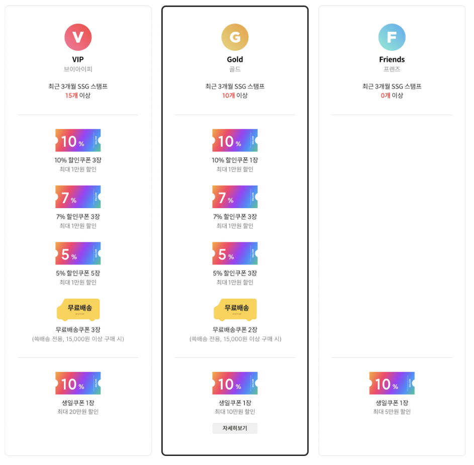 VIP (브이아이피) / GOLD (골드) / FRIENDS (프렌즈) 3개의 등급으로 나누어집니다.