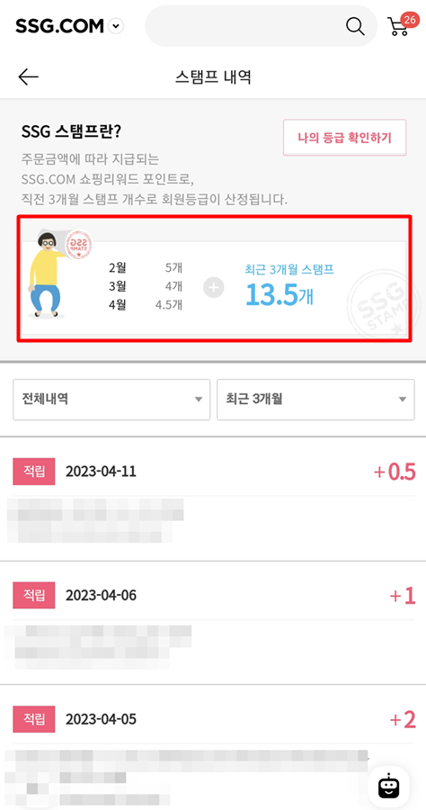 SSG 앱을 통해서 스탬프 내역을 조회하면 최근 3개월
