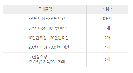 주문 1회당 구매 금액별로 스탬프가 아래의 기준으로 지급됩니다.
