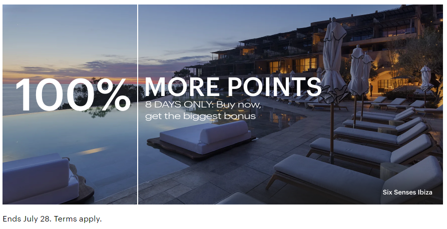 This Offer is available for qualifying purchases of IHG One Rewards points made between 12:00 AM ET on July 21, 2023 and 11:59 PM ET on July 28, 2023 (“Offer Period”). Members will receive a bonus of 100% of the points purchased when they meet a minimum points purchase threshold on a per transaction basis. The percentage bonus amount will show for eligible members when they log into their IHG One Rewards account. (Please click through to access the landing page for the Offer.) The number of points a member may purchase, gift, or receive as a gift during the Offer Period is subject to annual limits under the IHG One Rewards Membership Terms and Conditions, which are available on www.ihg.com. Members may purchase a maximum of up to 150,000 points during a calendar year, so the number of points a member can purchase during the Offer Period will depend on how may points the member had already purchased during the same calendar year. For example, if a member had previously purchased 50,000 points in 2023, then the member could only purchase up to a maximum of 100,000 points during the Offer Period and would be eligible to receive the applicable percentage of additional bonus points under this Offer based only on the amount of points purchased during the Offer Period. Similar limits apply to gifting points and receiving points as a gift: Members may gift up to a maximum of 150,000 points, or receive as gifts from other members a combined maximum of up to 150,000 points, during the Offer Period, subject to reduction by the number of points that have been already gifted, or received as a gift, in the same calendar year.