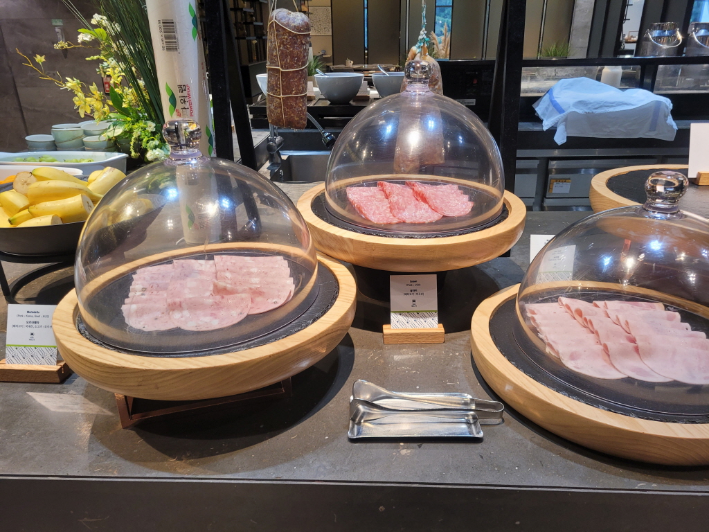 훈제연어와 비어햄, 모르따벨라햄, 과일과 요거트가 어제와 큰 차이가 안느껴지네요..