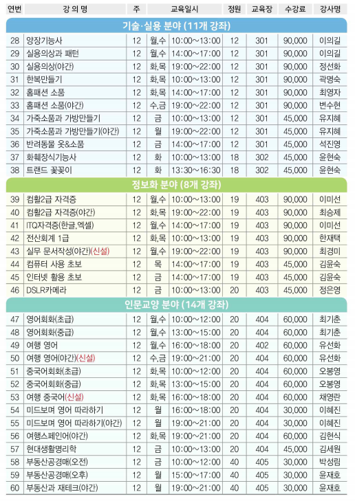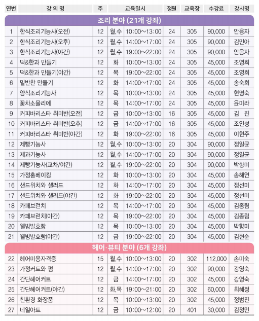 - 모집인원 : ‘한식조리기능사’ 등 총 88강좌 1,719명
