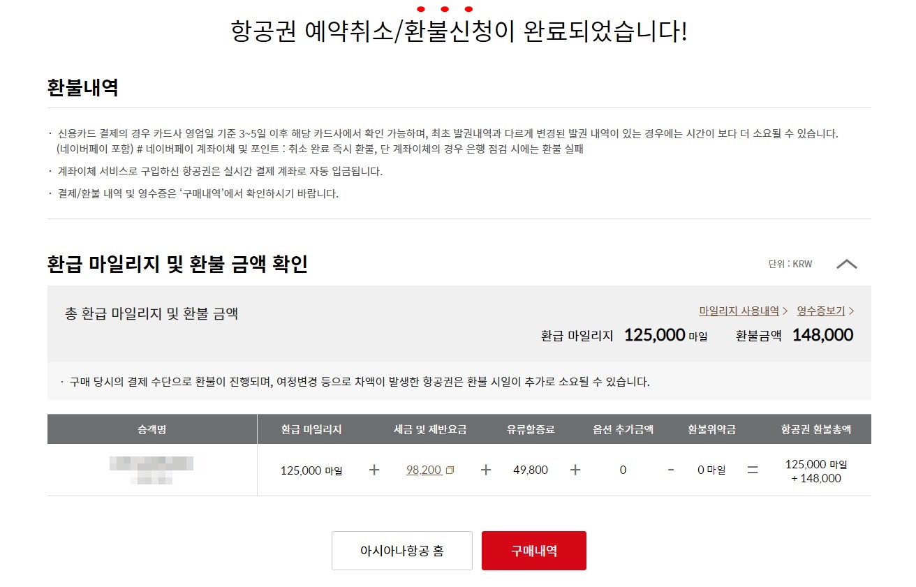다행히, 아시아나 국제선 마일리지 항공권의 경우 91일 이전 환불 시