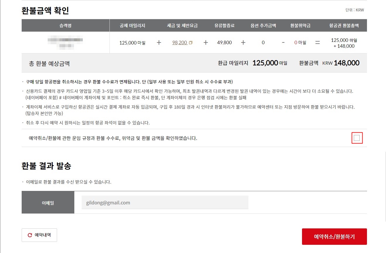 예약 내역을 누르면 예약 상세 정보가 보이며, 금액과 마일리지 확인 후 예약 취소/환불을 클릭합니다.