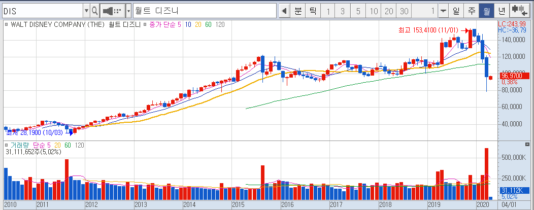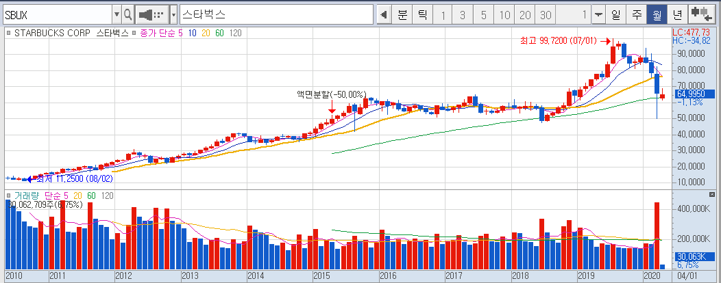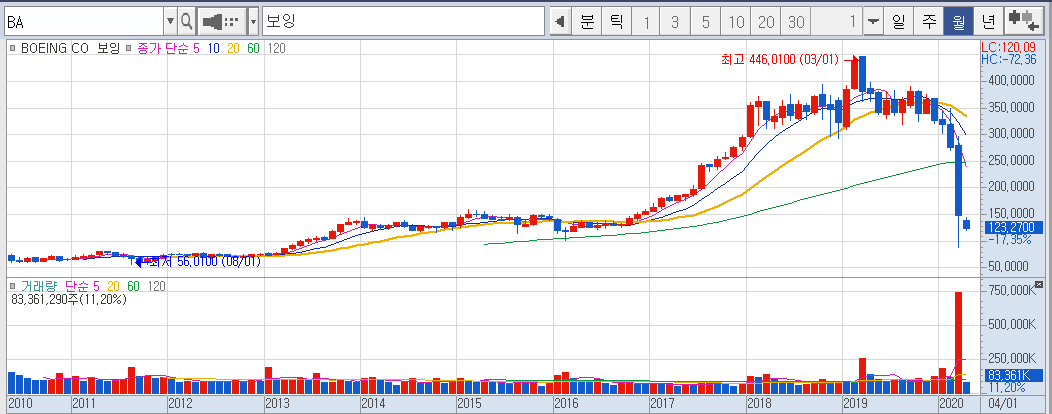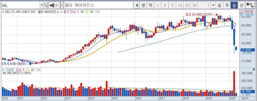 코로나19로 인하여 월봉그래프 모두 2020년 들어서 하락세를 보이고 있습니다.