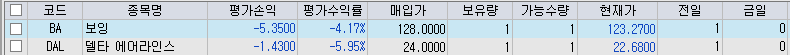 그나마 매입한 보잉과 델타도 예약금액보다 더 떨어졌네요..