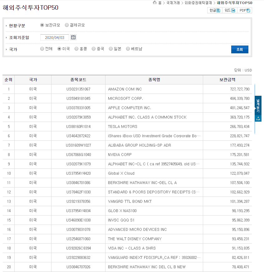 예탁결제원에서 2018년 7월 부터 증권정보포털을 통해 해외주식투자 TOP 10을 제공하였는데