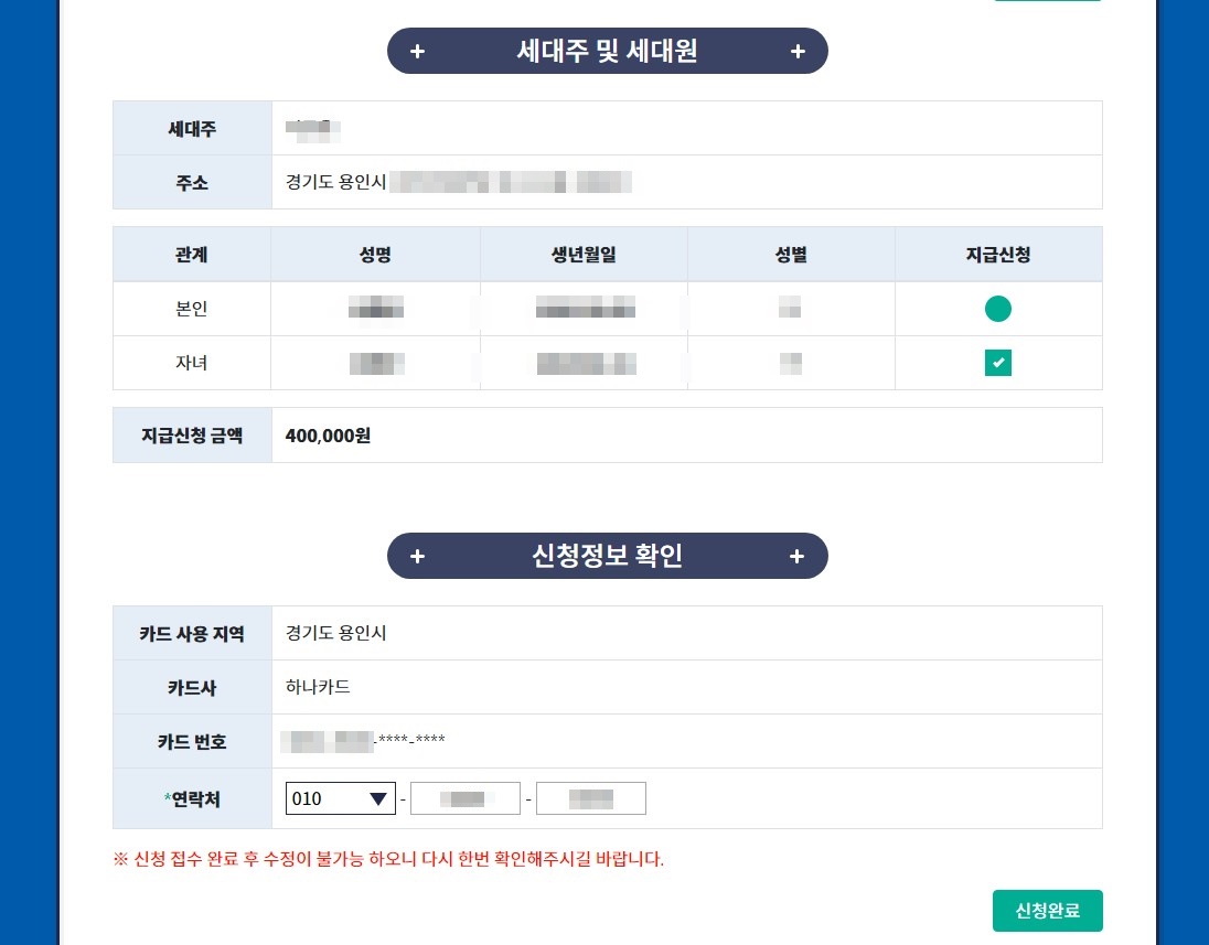 자녀 선택하니 40만원으로 지급신청금액이 변경되었습니다.