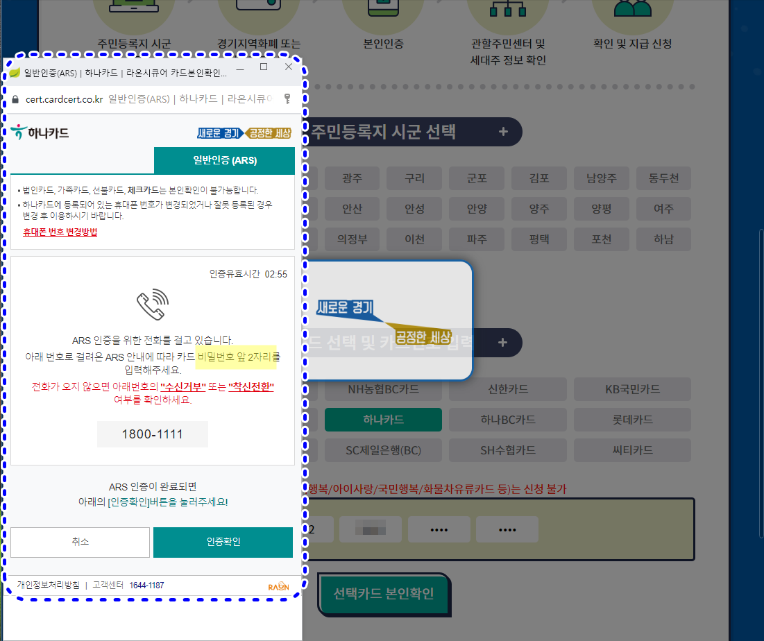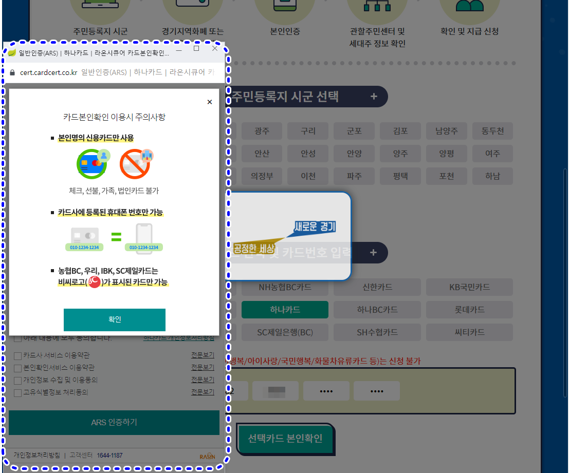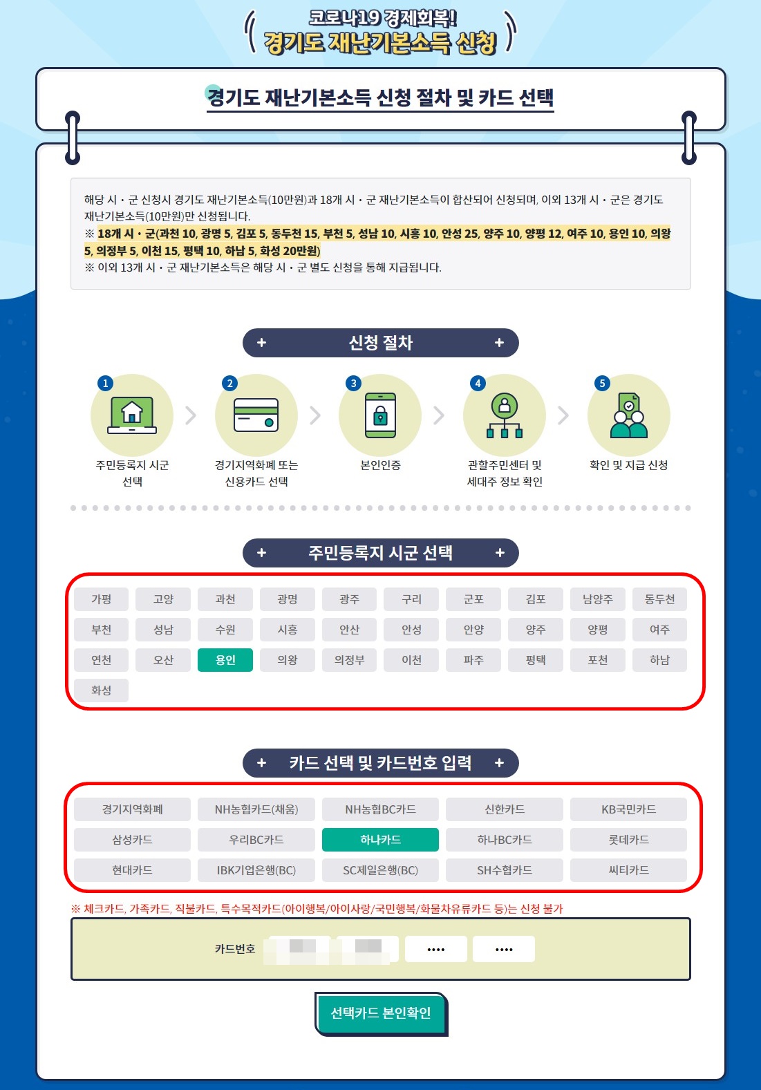 신청절차에 대한 안내와 본인이 거주하는 주민등록지 시군을 선택 및 카드사를 선택하는 부분이예요